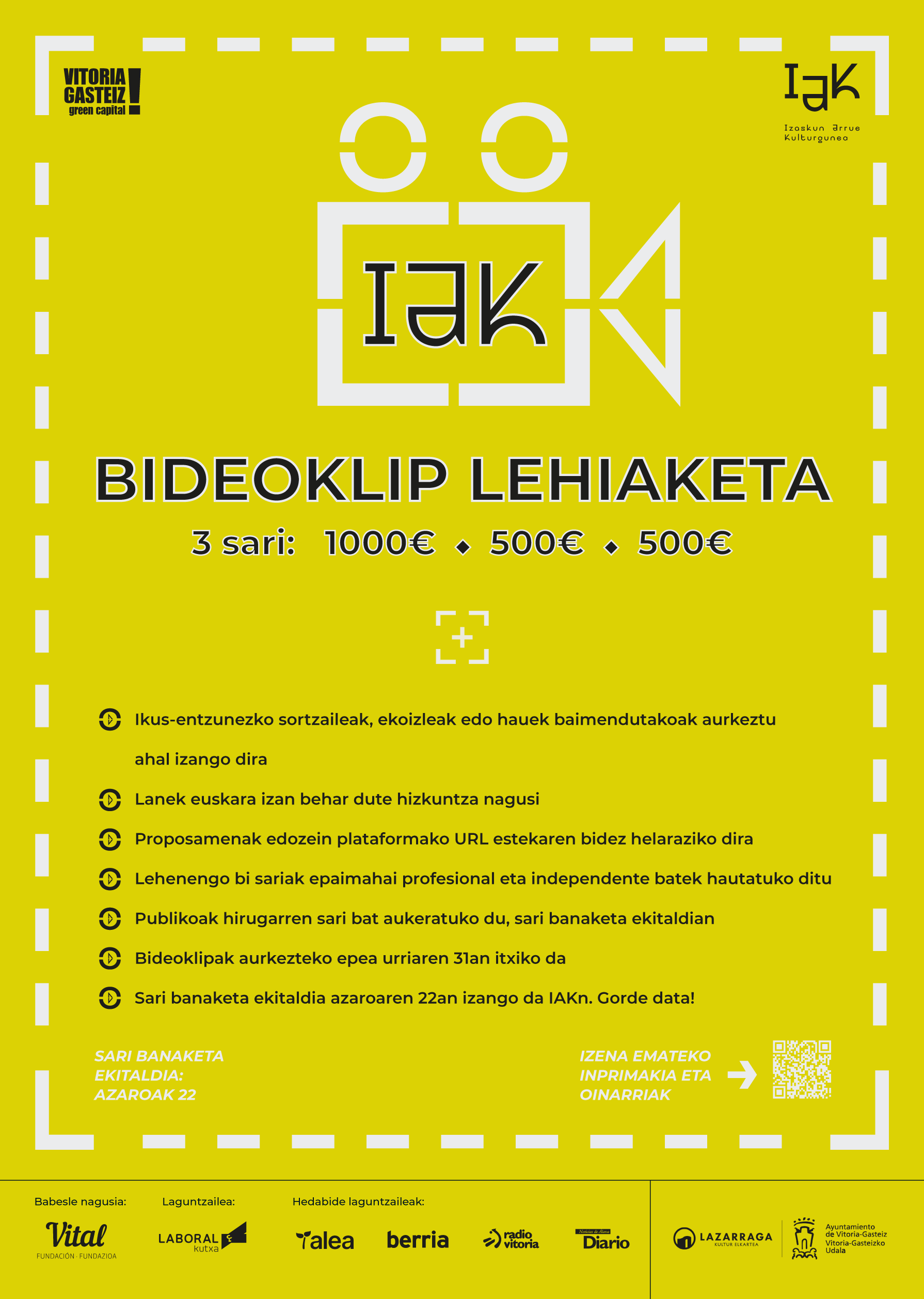 IAK Bideoklip Lehiaketaren lehen edizioa 2025 abian jarri da, euskal musikari lotutako ikus-entzunezko lanak saritu, aitortu eta bultzatzeko helburuarekin. Ikus-entzunezkoen sortzaile eta ekoizleei lanak aurkezteko gonbitea luzatu nahi diegu. Baldintza bakarra: aurkeztutako lanen hizkuntza nagusia euskara izan behar da.