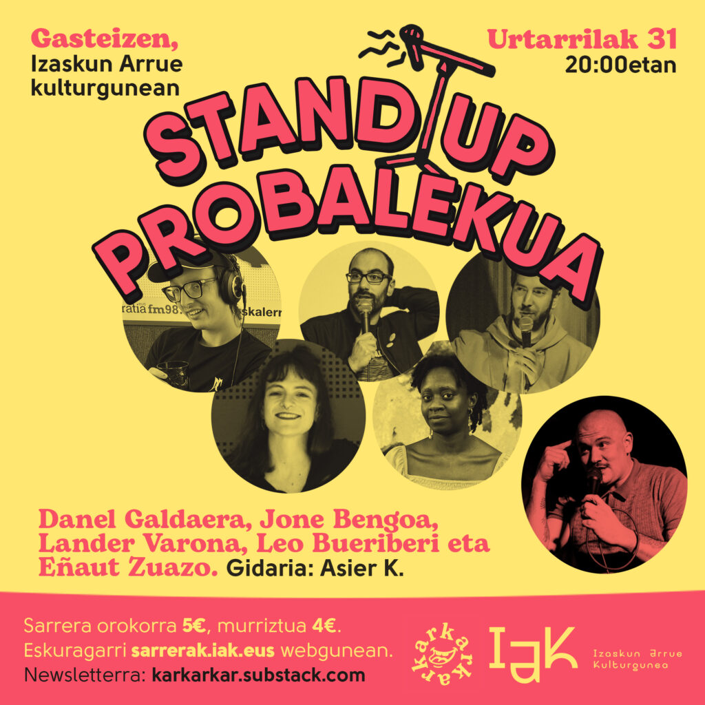 Karkarkar: Probalekua. Euskara hutsean egindako umorezko bakarrizketa saioa | Probalekua euskarazko umorezko bakarrizketen saioa da, non parte-hartzaileek hamar minutuko testuak aurkezteko aukera izango duten. Urtarrilaren 31an egingo den IAKko lehen standup saio honetan Danel Galdaera, Jone Bengoa, Lander Varona, Leo Bueriberi eta Eñaut Zuazok hartuko dute parte, saioaren gidaria Asier K. izanik. Karkarkar euskara hutsean egiten den lehenengo mikrofono irekia da, eta komediagileen, ikus-entzuleen eta komedia zaleen topagunea izatea da bere helburu nagusia. Hiru Damatxoren eskutik sortutako ekimen honek Donostiako DOKA antzokian eman zituen lehenengo pausuak eta 2025ean Arabako ikusleen umore-sena neurtzera dator Gasteizera.
