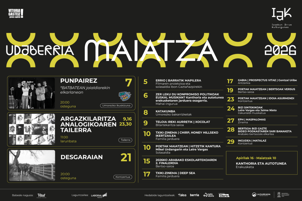 Arabako Bertso-eskolartekoa | Es una fiesta de bertsolaris y bertsolaris de entre 14 y 18 años. Diferentes bertsolaris y miembros de las bertso-eskolas participan en las semifinales y final del campeonato escolar. Seis bertsolaris clasificados desde semifinales conformarán la final del campeonato escolar de bertsolaris de Álava.
