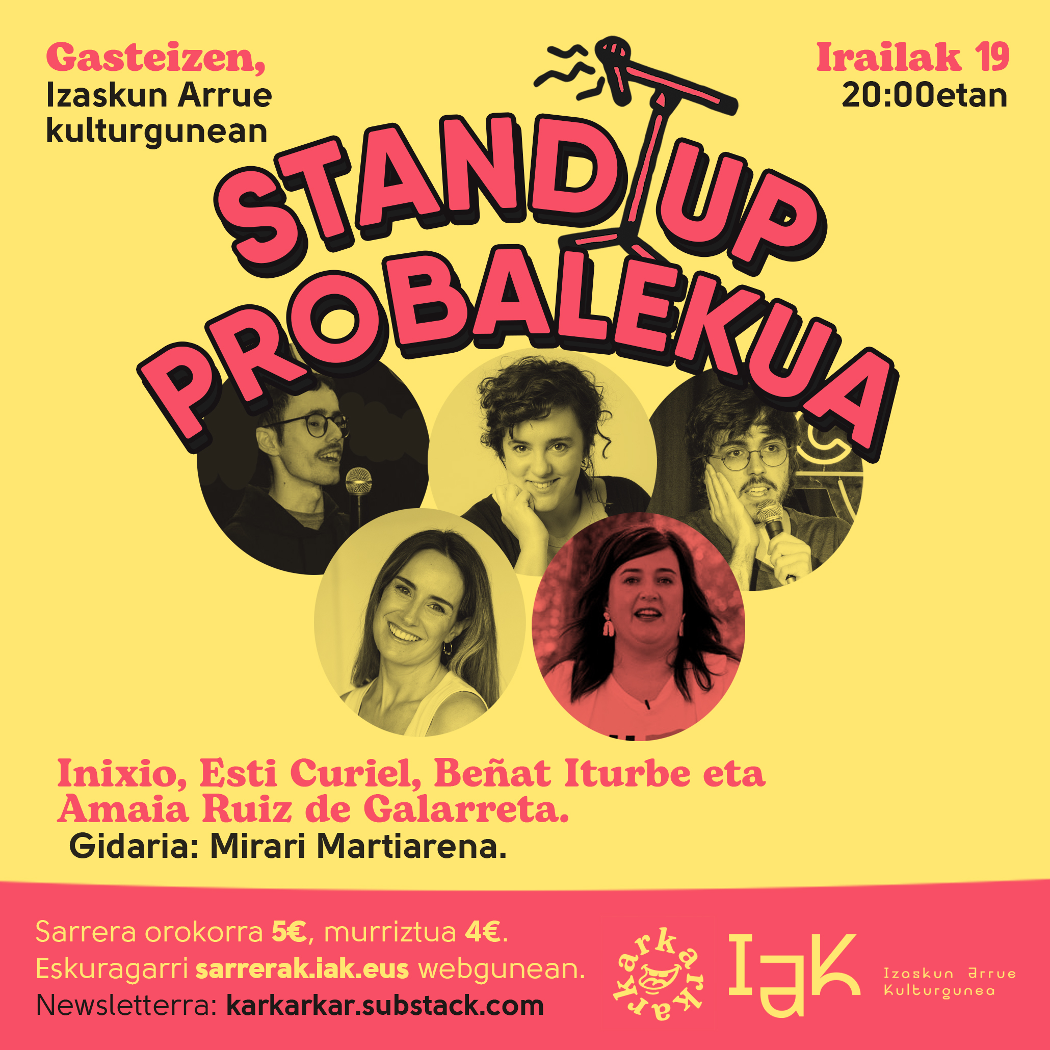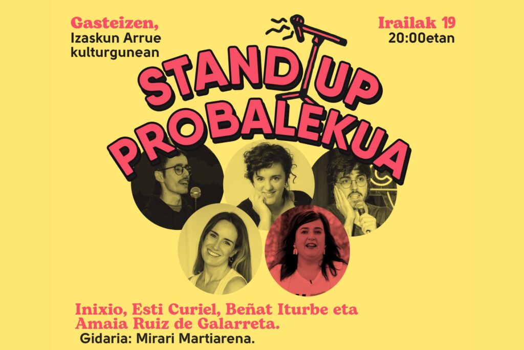 KARKARKAR. Probalekua. Monólogos humorísticos en euskera | Probalekua es una sesión de monólogos humorísticos en euskera, donde las personas participantes tienen la oportunidad de presentar textos de diez minutos. Karkarkar es el primer micrófono abierto exclusivamente en euskera, y su objetivo principal es ser un punto de encuentro para personas comediantes, espectadoras y amantes de la comedia. Este proyecto, creado por Hiru Damatxo, comenzó en el teatro DOKA de Donostia y en 2025 llegó a Gasteiz para poner a prueba el sentido del humor de la audiencia arabarra.