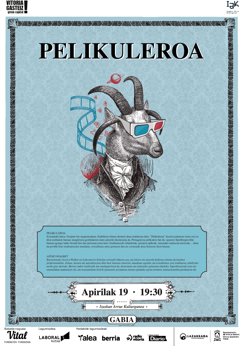 PELIKULEROA. Aitor Vinagret | Escenario vacío. Un cuerpo en movimiento. Sus voces lo transforman todo. “Pelikuleroa” es un espectáculo teatral que invita al espectador a sumergirse en la mente de alguien que nunca ha dejado de jugar. El protagonista es un «peliculero», un tipo depersona que vive cada día como si estuviera en una producción de Spielberg. Explosiones imaginarias, acontecimientos épicos, historias de amor de cine… todo es posible en su mundo, donde la realidad se queda corta y la creatividad lo llena todo.